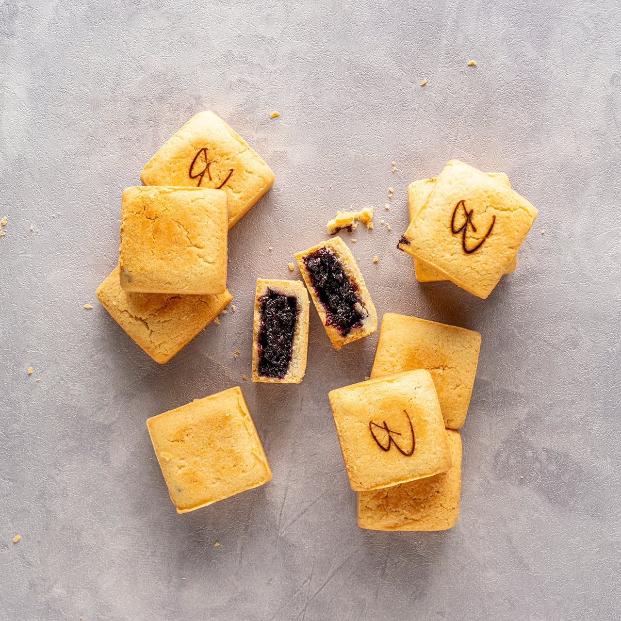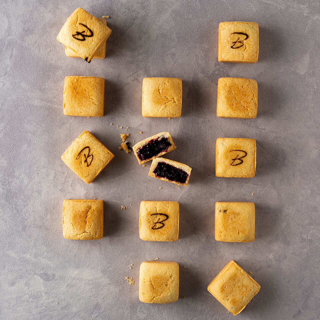 ブルーベリーキューブケーキは、バター香るほろほろサブレ生地でブルーベリー餡を包んだ焼菓子です。